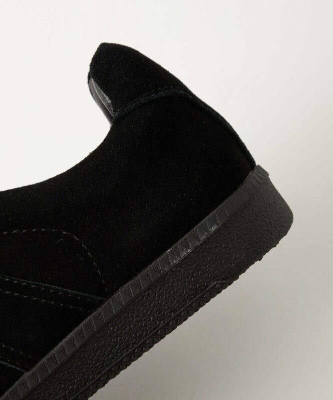 この靴の最大の特徴は、隅々まで黒のスエードで統一されていることです。